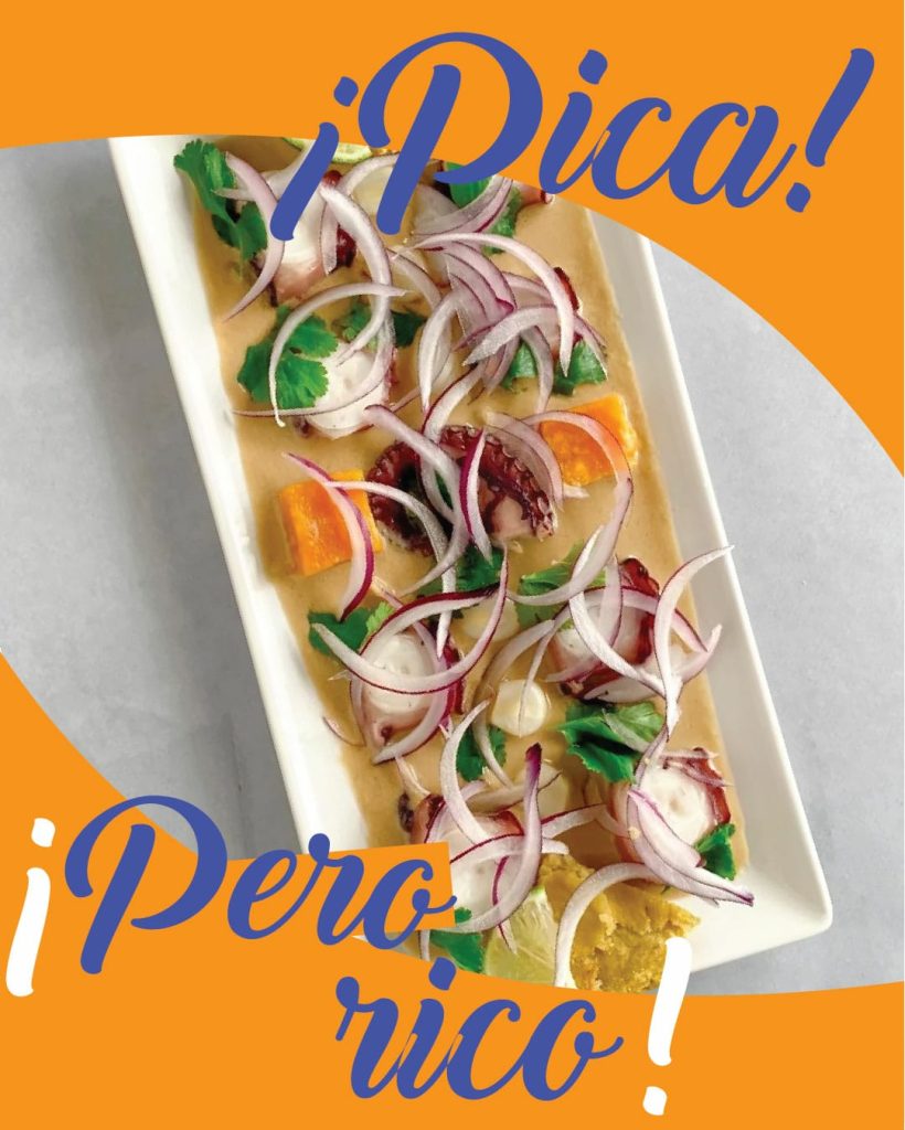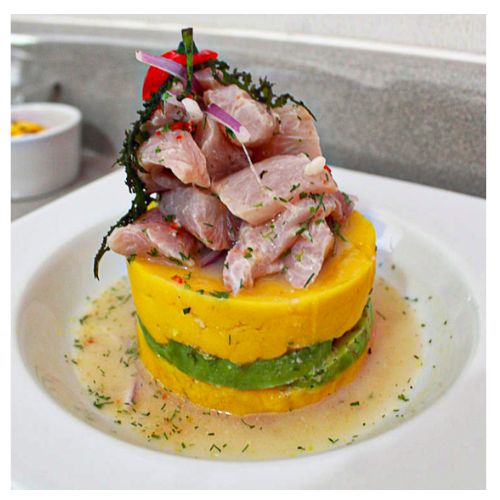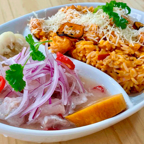 Disfruta de un fresco ceviche acompañado de un delicioso arroz con mariscos, en un solo plato que celebra lo mejor de la cocina marina peruana.