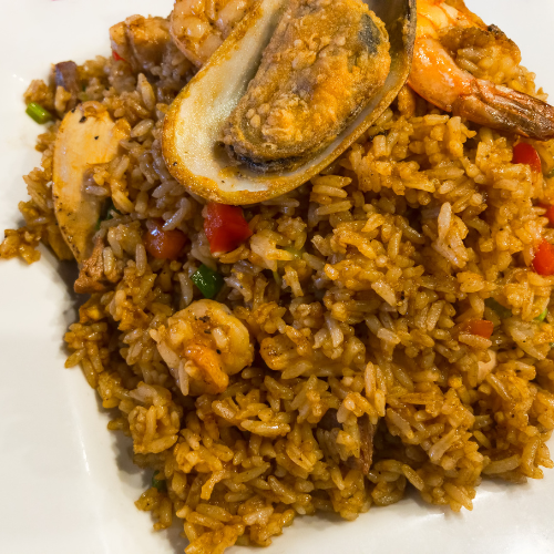 Fusión perfecta de mar y sazón: prueba nuestro irresistible chaufa de mariscos.
